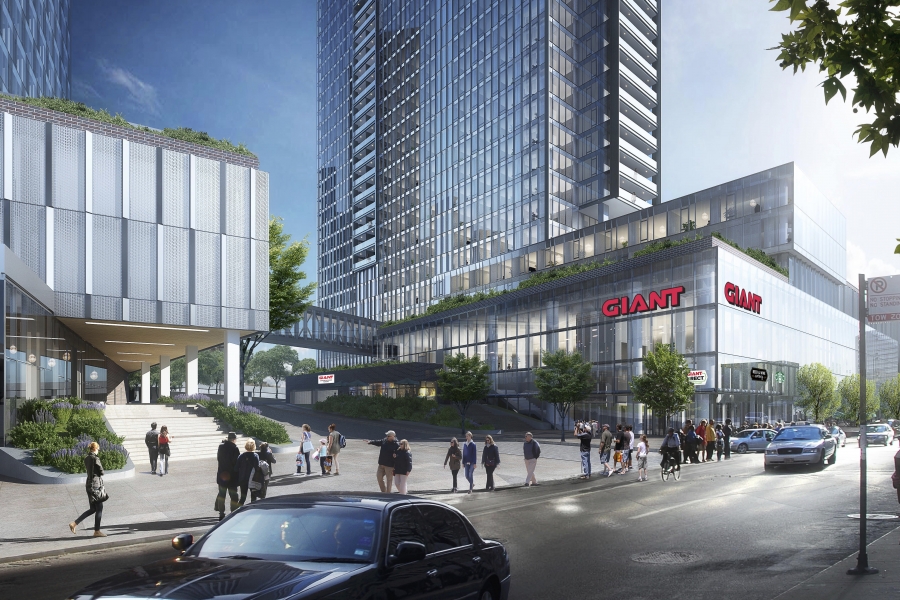 While these dynamic buildings were designed with cohesion in mind, they stand at different heights with subtle differences in the angle of the building placement and texture of their skins, causing the reflection of the sun to give each a unique appearance. The 28-story tower at 60 N. 23rd Street houses most of the shared activity-oriented rooftop amenities, including terraces, a luxurious infinity pool, lounge, and state-of-the-art fitness center, as well as on-site parking and more than 72,000 sf of ground-floor retail space — including a flagship two-story, 65,000-sf Giant supermarket. One of the largest grocery stores in Center City, this groundbreaking retail outlet will feature online shopping and delivery service, plus an outdoor terrace where shoppers can dine, enjoy live music, or host private events.